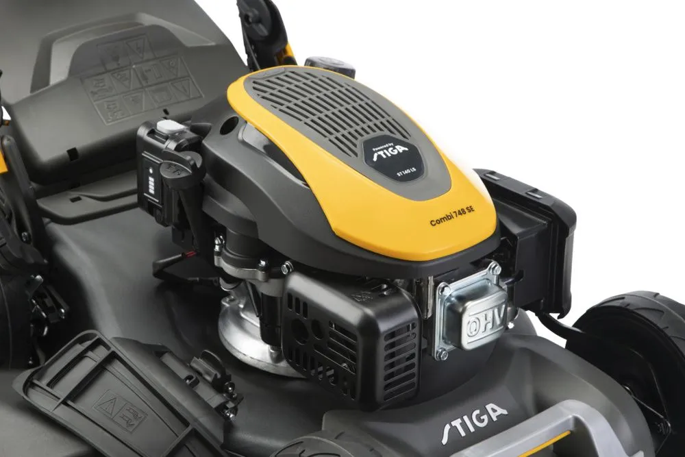 Der selbstfahrende Rasenmäher STIGA Combi 748 SE hat eine Schnittbreite von 46 cm und einen 60-Liter-Hybrid-Grasfangkorb mit Grasfangkorb-Vollanzeige. Das Stahlchassis beherbergt einen zuverlässigen 139 ccm STIGA ST 140 LS Motor mit einer Nettoleistung von 2,20 kW bei 2900 U/min und einem praktischen Elektrostartknopf für den Lithium-Akku. Beim Combi 748 SE kannst du zwischen 4 verschiedenen Funktionen wählen: Heckauswurf, Seitenauswurf, Aufsammeln oder Mulchen, bei dem das Schnittgut fein zerkleinert und zur Düngung des Bodens auf dem Boden abgelegt wird. Die zentrale Schnitthöhe lässt sich einfach mit einem Hebel auf 6 verschiedene Positionen einstellen, von 22 bis 80 mm. Die großen (280 mm) Hinterräder machen das Manövrieren auf unebenem Gelände einfach. Seitenabweiser und Mulchstopfen sind im Lieferumfang enthalten. Der Grasfangkorb ist mit einem Aufsatz versehen, um ihn einfach an die Maschine anzuschließen und den Verlust von Grasschnitt beim Abnehmen zu vermeiden.